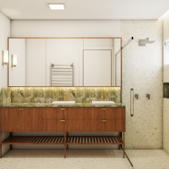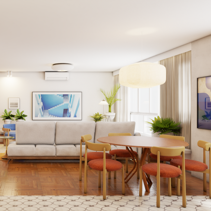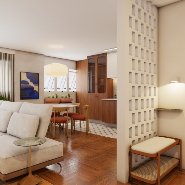 O partido do projeto é atualizar o layout pra rotina urbana contemporânea sem descaracterizar sua linguagem dos anos 60. A estrutura pensada com maestria por arquitetos da época possibilita a remoção de todas as paredes da cozinha, dando espaço pra um espaço de convivência dinâmico e integrado. Essa vai ser um obra restaurativa, respeitando a proposta original de materialidade e aproveitando a qualidade da madeira que conecta com o conceito criativo do projeto que valoriza as superfícies naturais.