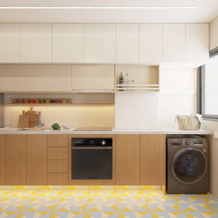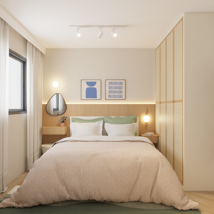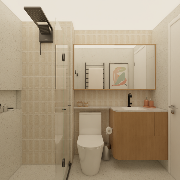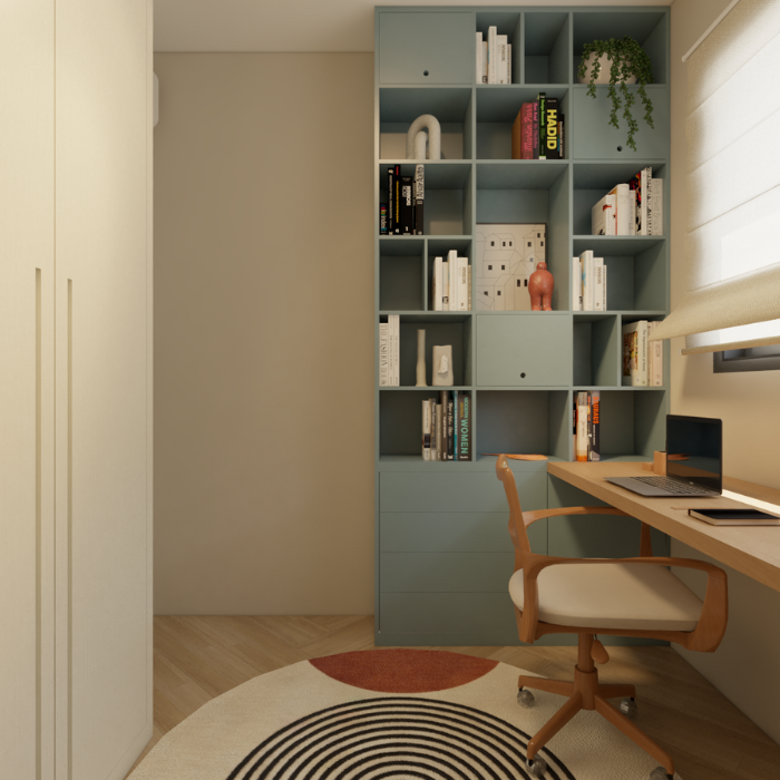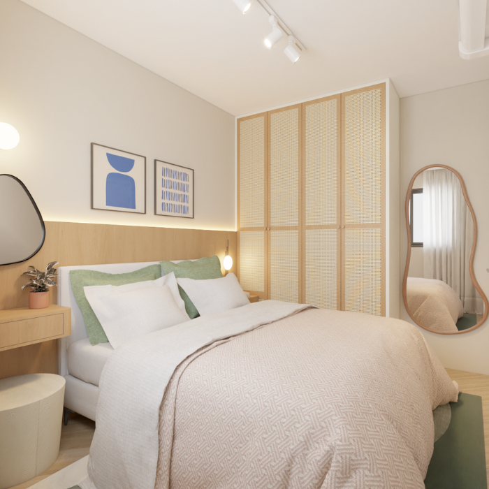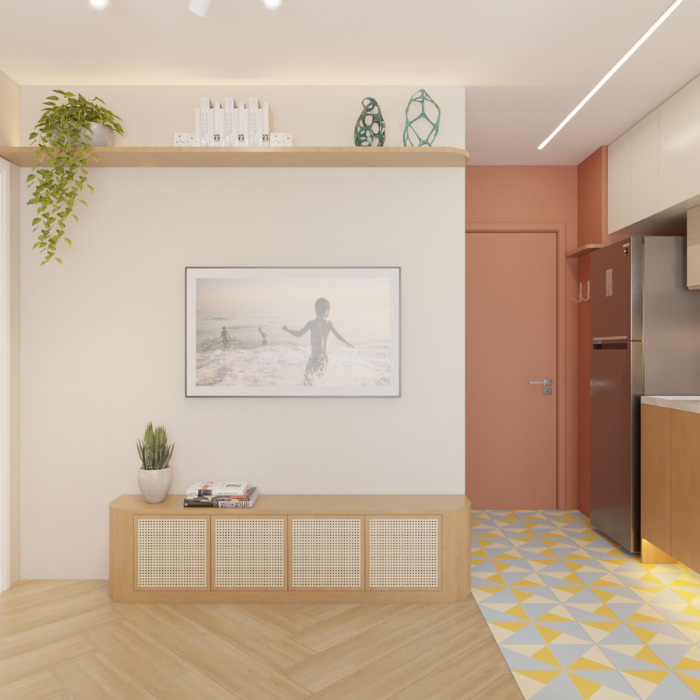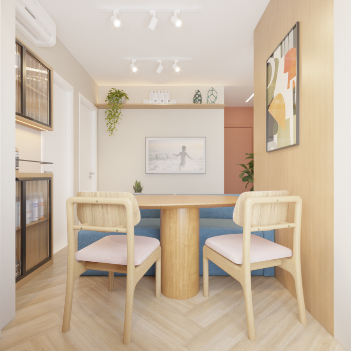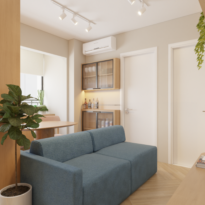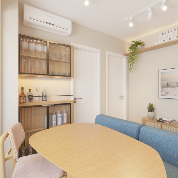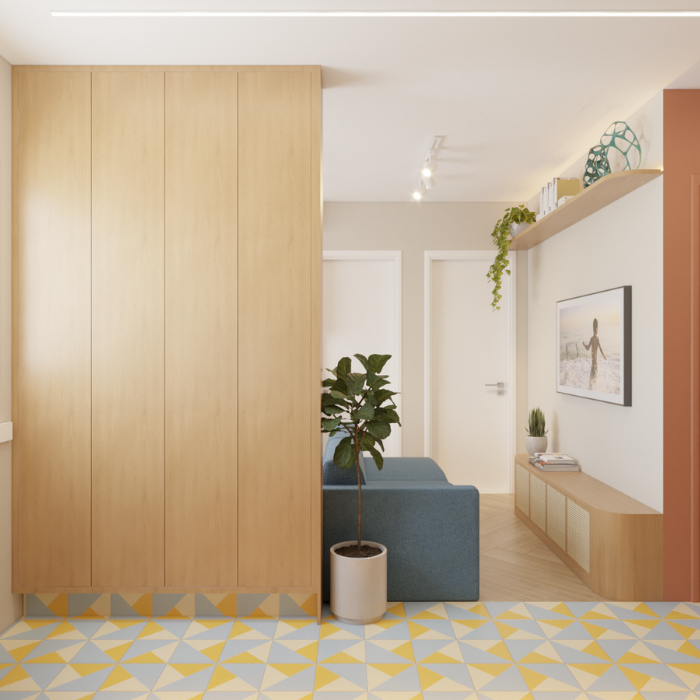 Um apartamento com tons inspirados nas cores do Brasil! Nesse apartamento o maior desafio foi o layout, o sonho da cliente era ter um sofá ilha, pra isso saímos totalmente do convencional, reorganizamos as atividades da área social. O sofá ilha ficou no centro da sala e conforma a sala de estar e a a sala de jantar na varanda. Na cozinha o piso de ladrilho conecta o hall de entrada marcado com os tons dos armários, um dos quartos vai ser usado como office e apoio para armazenamento, a estante azul reforça a paleta que escolhemos. No quarto de casal a palinha dos armários trás leveza e suavidade junto com a madeira clara.