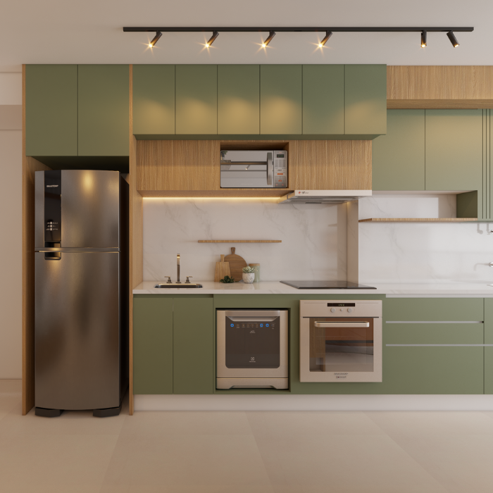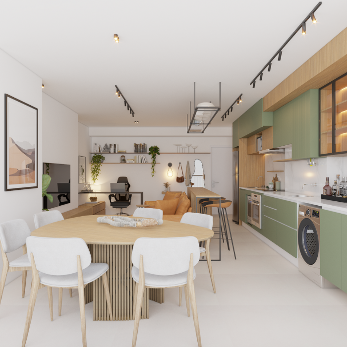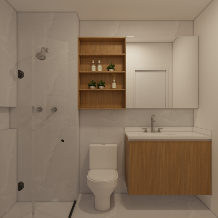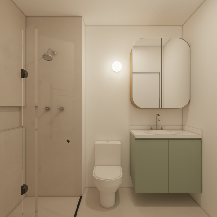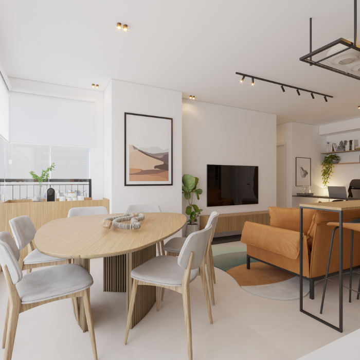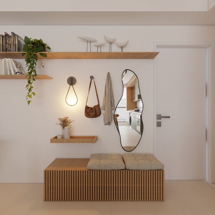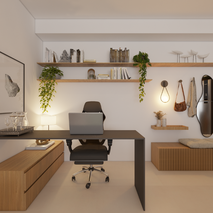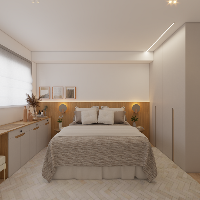 No apartamento TB a suíte do casal foi otimizada e além do armário ganhou uma bancada que ajuda no armazenamento de sapatos e serve como penteadeira e espaço de trabalho para os dias de home office