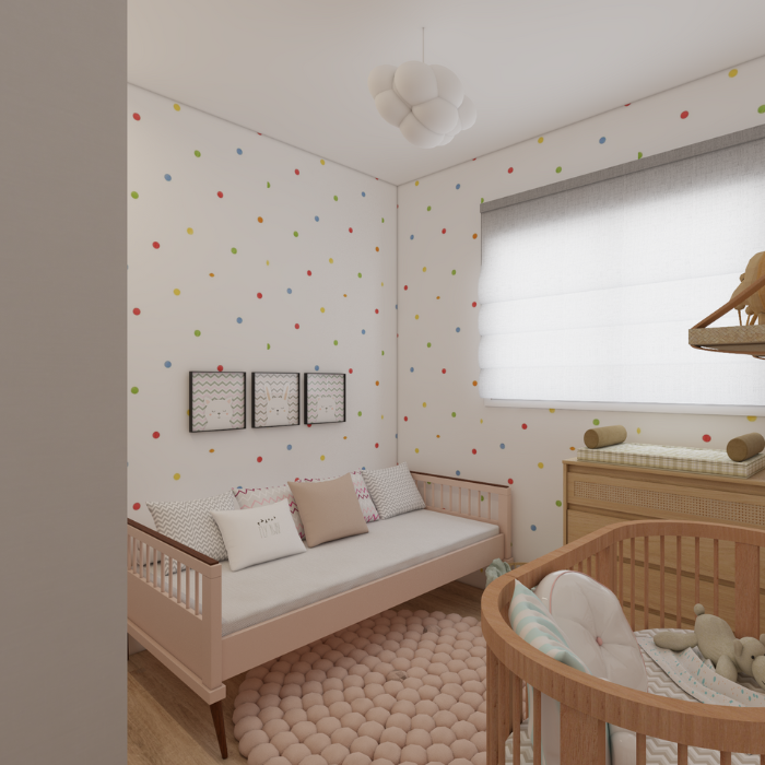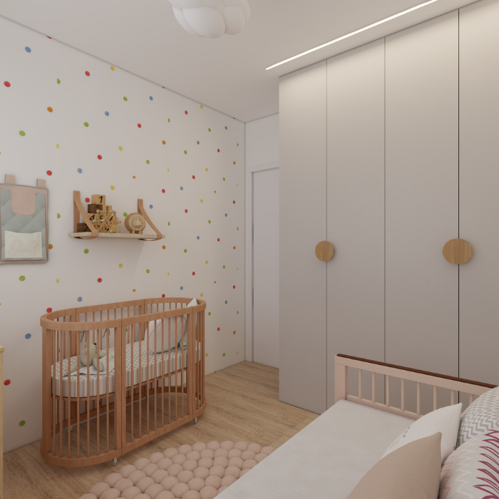 O quarto do bebê foi projetado com um conceito despojado e alegre, focado na praticidade para a rotina dos pais, garantindo um ambiente harmonioso e funcional.