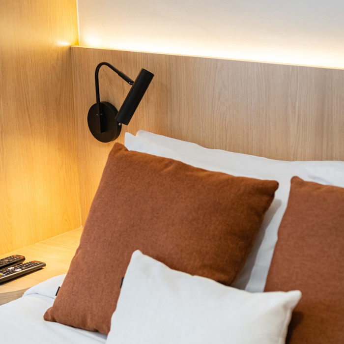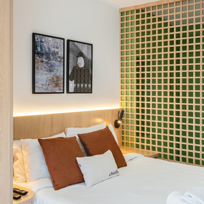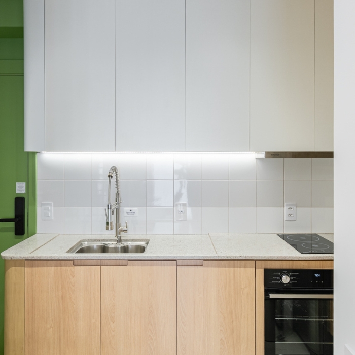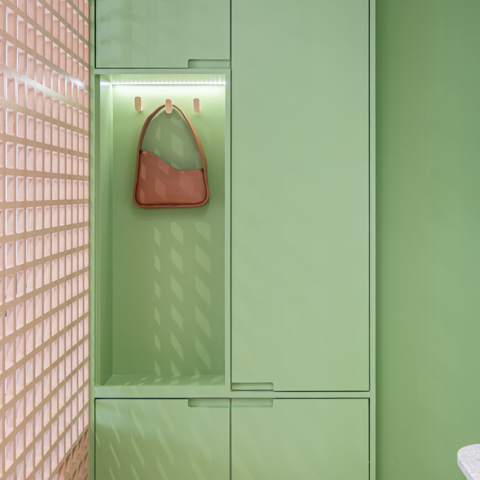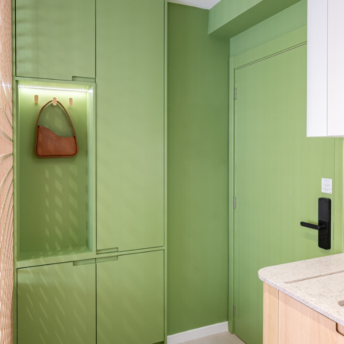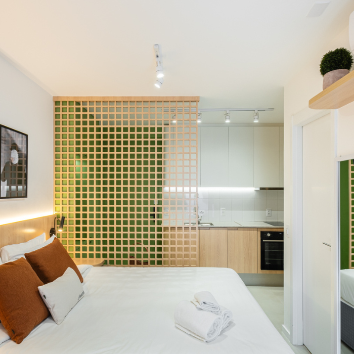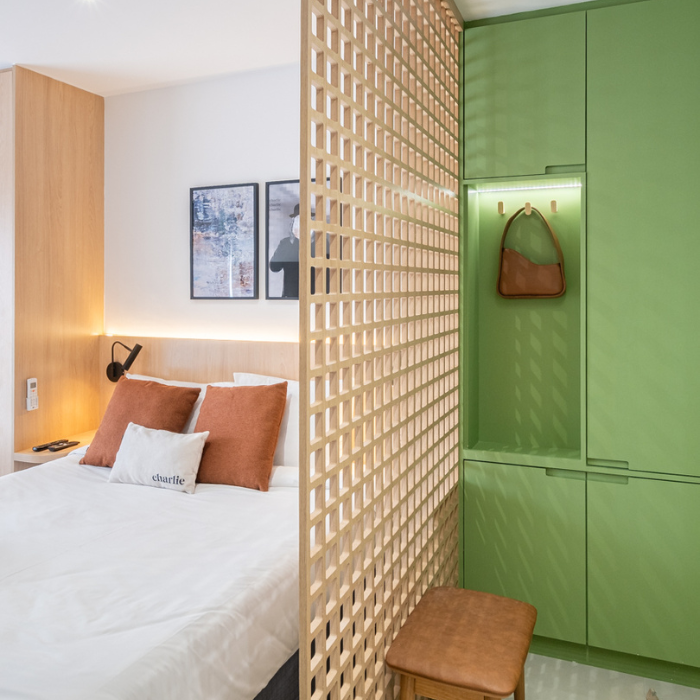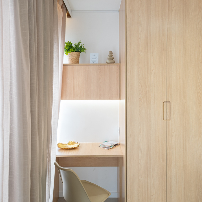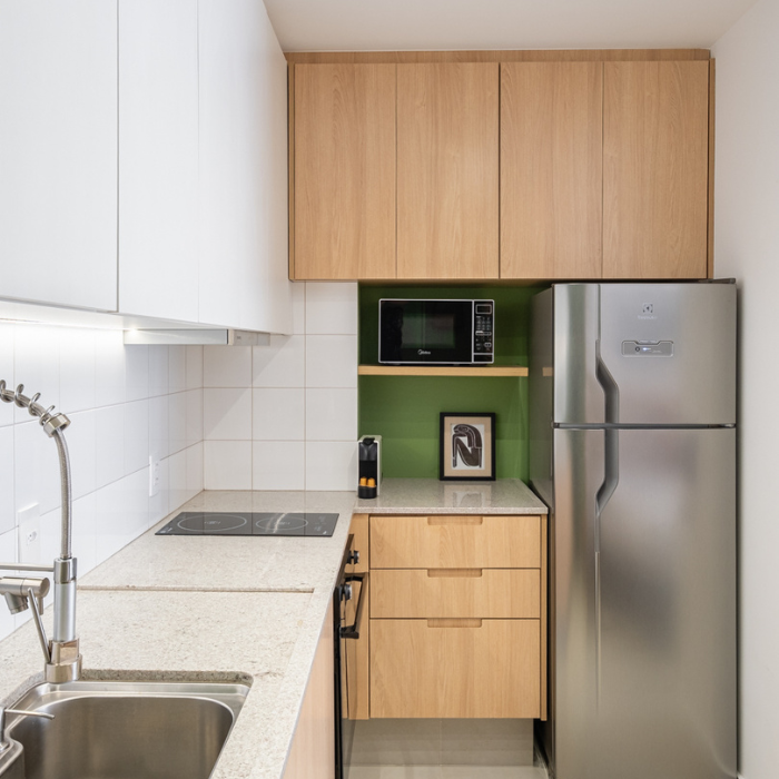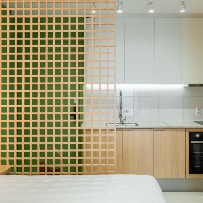 Studio de 24m2 feito para locação e que não demorou pra ser um sucesso depois que a reforma foi finalizada. O hall de entrada tem uma chapelaria completa para ancorar a entrada dos hóspedes, principalmente a noite. A cozinha foi feita pensando em economia e praticidade (e ganhou muita amplitude graças à nossa solução de layout). O protagonista do studio é o muxarabi como uma divisória criativa entre cozinha e cama. Além de ter dado pra colocar uma cama grande, ainda fizemos uma estação de trabalho.