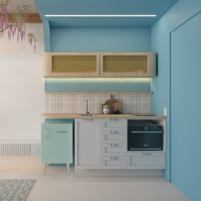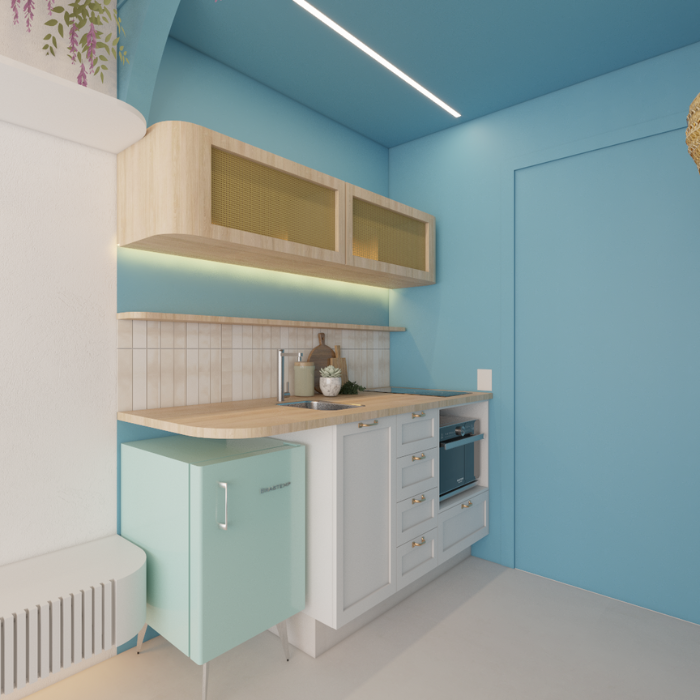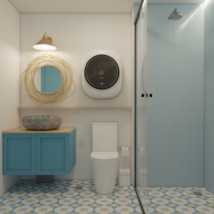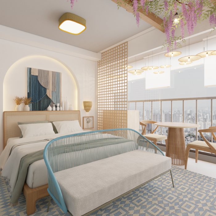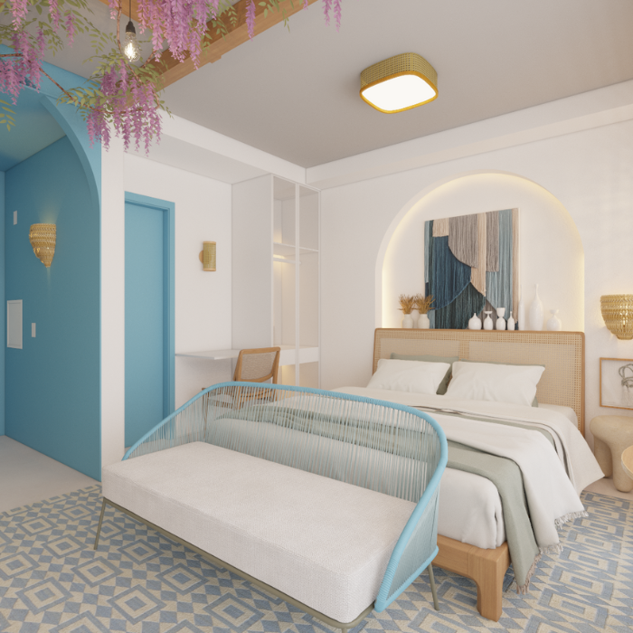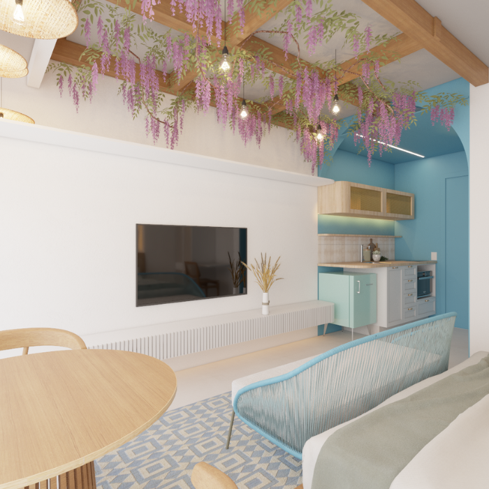Procurando se diferenciar no mercado de Airbnb, esse investidor nos procurou com dois apartamentos na região de Moema e pediu pra um deles ser inspirado na Grécia. Se tratando de um apartamento de curta temporada tivemos liberdade de seguir por uma linha mais temática, logo na entrada marcada de azul tem a cozinha equipada pra pequenas refeições e um armário mimetizado pra vassoura e rodo, seguindo para o quarto vc passa para um arco e em seguida tem o gazebo cheio de flores. As paredes foram texturizadas com cal pra trazer a sensação de estar na Grécia mesmo. Atrás da cama um arco iluminado deixa o ambiente mais confortável com a luz indireta e no banheiro o ladrilho inspirado nas cores deixa a experiência mais interessante.