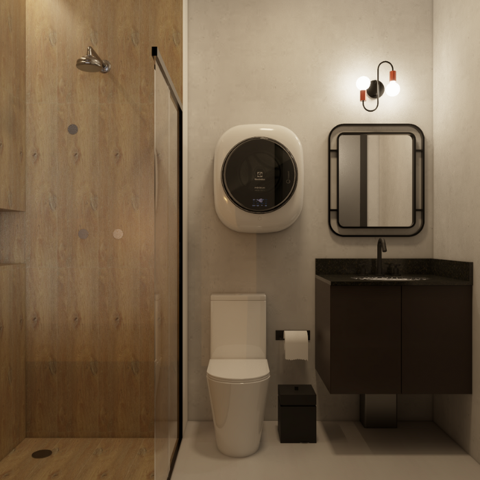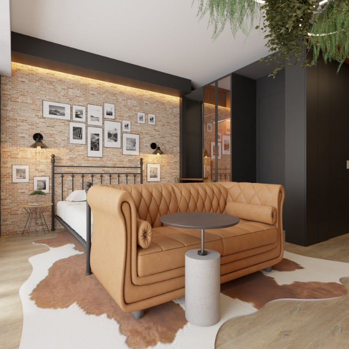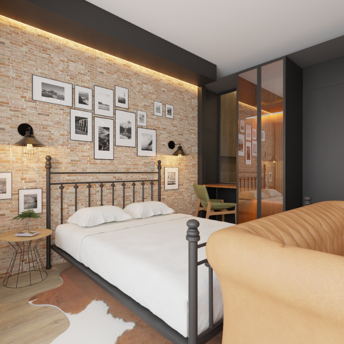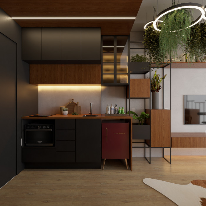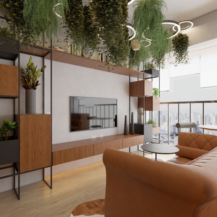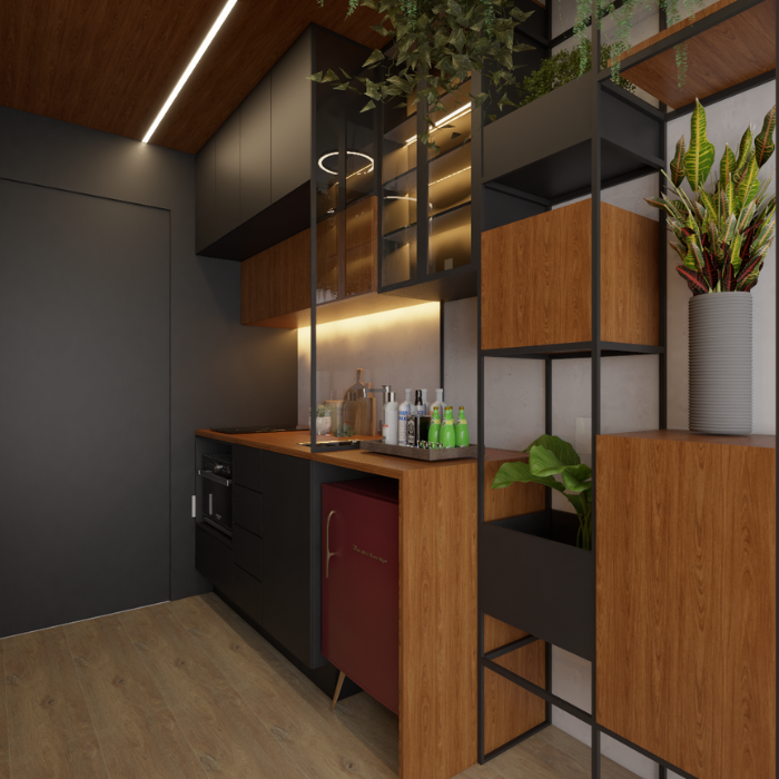 O segundo apartamento desse investidor foi inspirado nos Loft’s de Manhattan, aqui temos tijolo aparente que de fato foi feito com tijolo recortado e não revestimento, a iluminação foi criada por nós in loco bom barras de serralheria e perfil de LED embutido. Pra reforçar a estética industrial trabalhamos com uma estante com perfil preto e madeira. nas paredes e no teto aplicamos cimento queimado e a marcenaria foi feita no preto com iluminação interna.